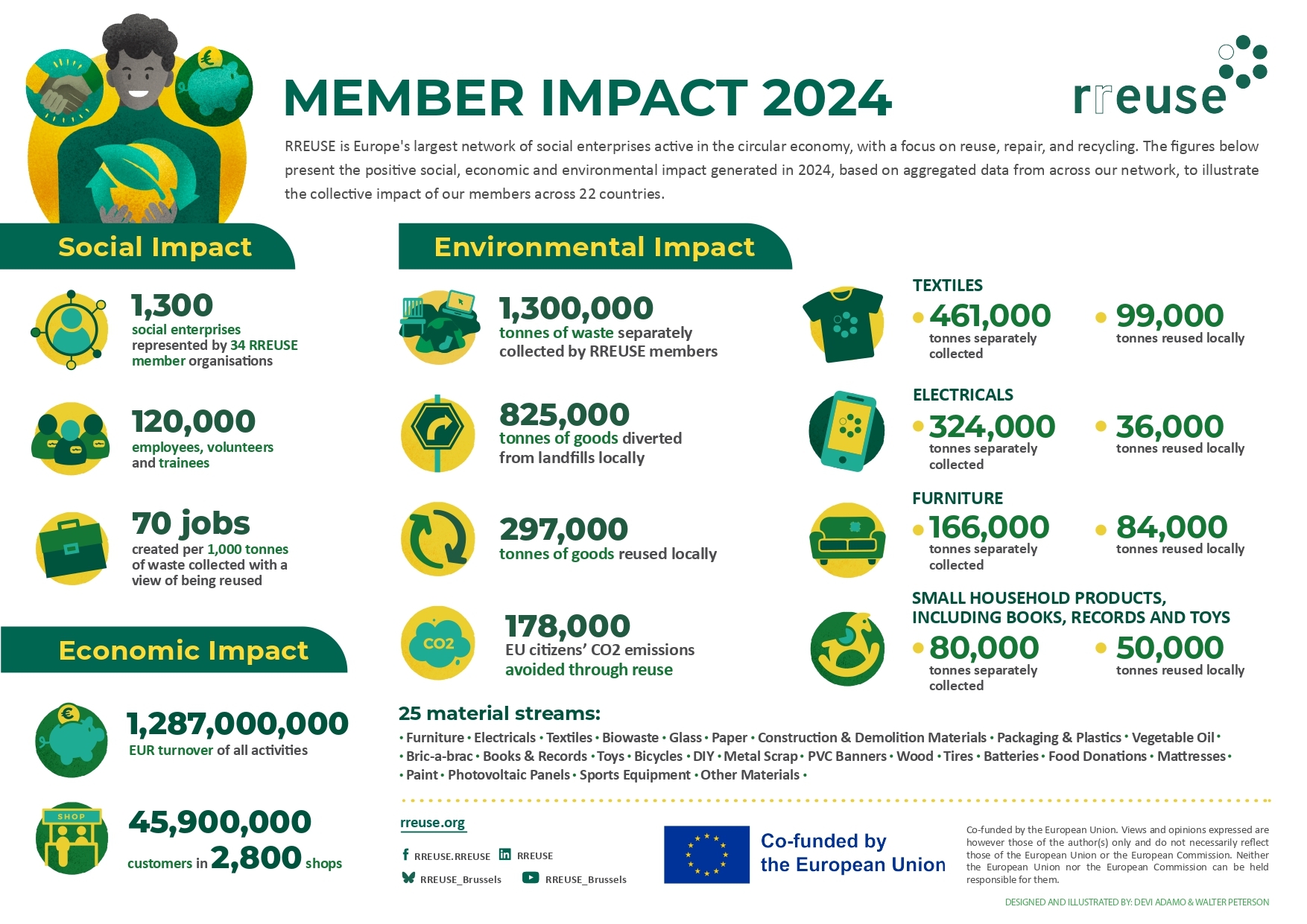 RREUSE social enterprise members across Europe extend product lifespans, create inclusive local jobs, and generate economic value through circular economy activities. Each year, RREUSE collects data from the network to capture the scale of this work. The member impact infographic compiles these results, highlighting their collective social, environmental, and economic contributions.